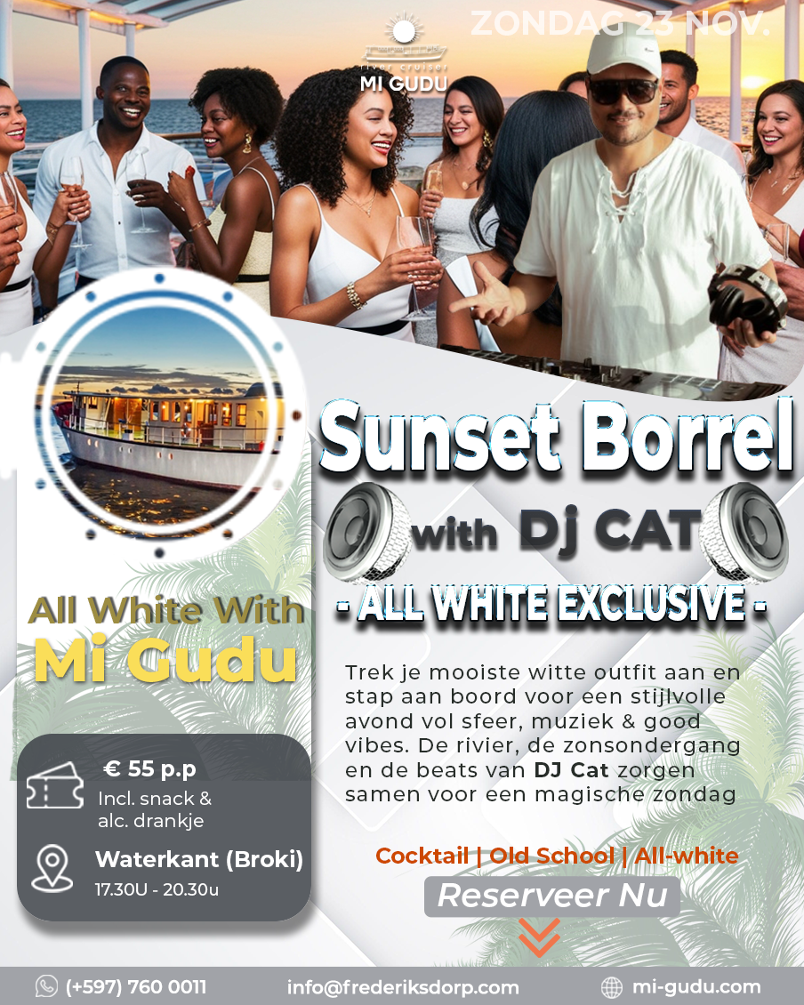 Reserveer nu:(+597) 7600011[email protected]of registeer via de link:https://bit.ly/RegistrationSunsetBorrel23Nov2025